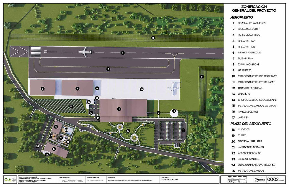 Este trabajo de grado (tesis) se centra en el diseño del Aeropuerto Nacional Capitán Alonso Valderrama, ubicado en Panamá, provincia de Herrera, que busca aportar soluciones innovadoras para optimizar tanto la infraestructura como la experiencia del usuario del transporte aéreo. Para lograr este objetivo, se considerarán varias áreas clave, desde la planificación y el diseño arquitectónico hasta la implementación de tecnologías avanzadas y la incorporación de espacios públicos entorno al paisaje inmediato del aeropuerto que fomenten el turismo interno de la región.